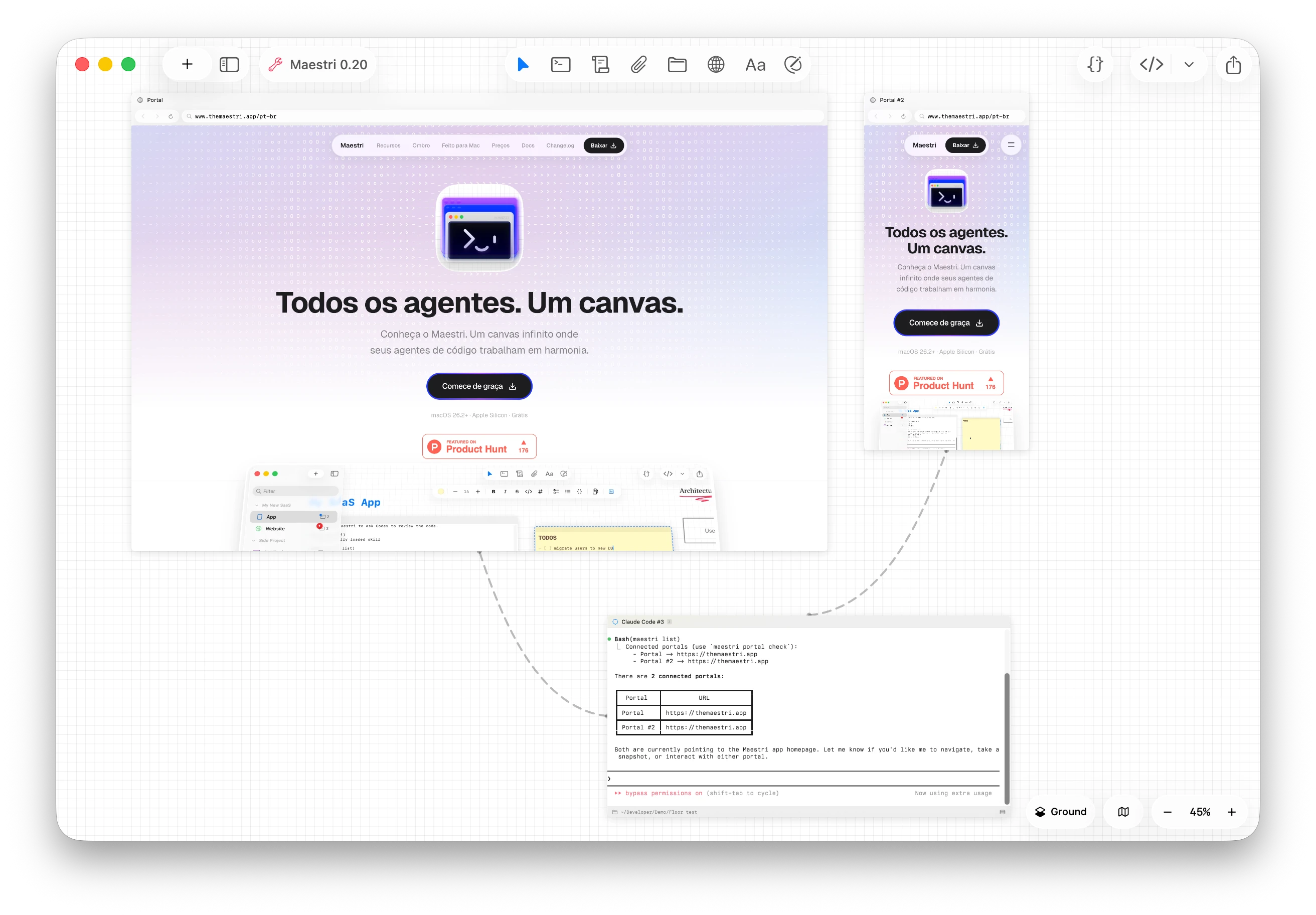 Quando um portal está conectado ao terminal de um agente, o agente pode controlá-lo programaticamente usando o CLI maestri. Sem dependências externas, sem servidores MCP, sem configuração — apenas conecte e use. Como tudo no Maestri, é plug and play.